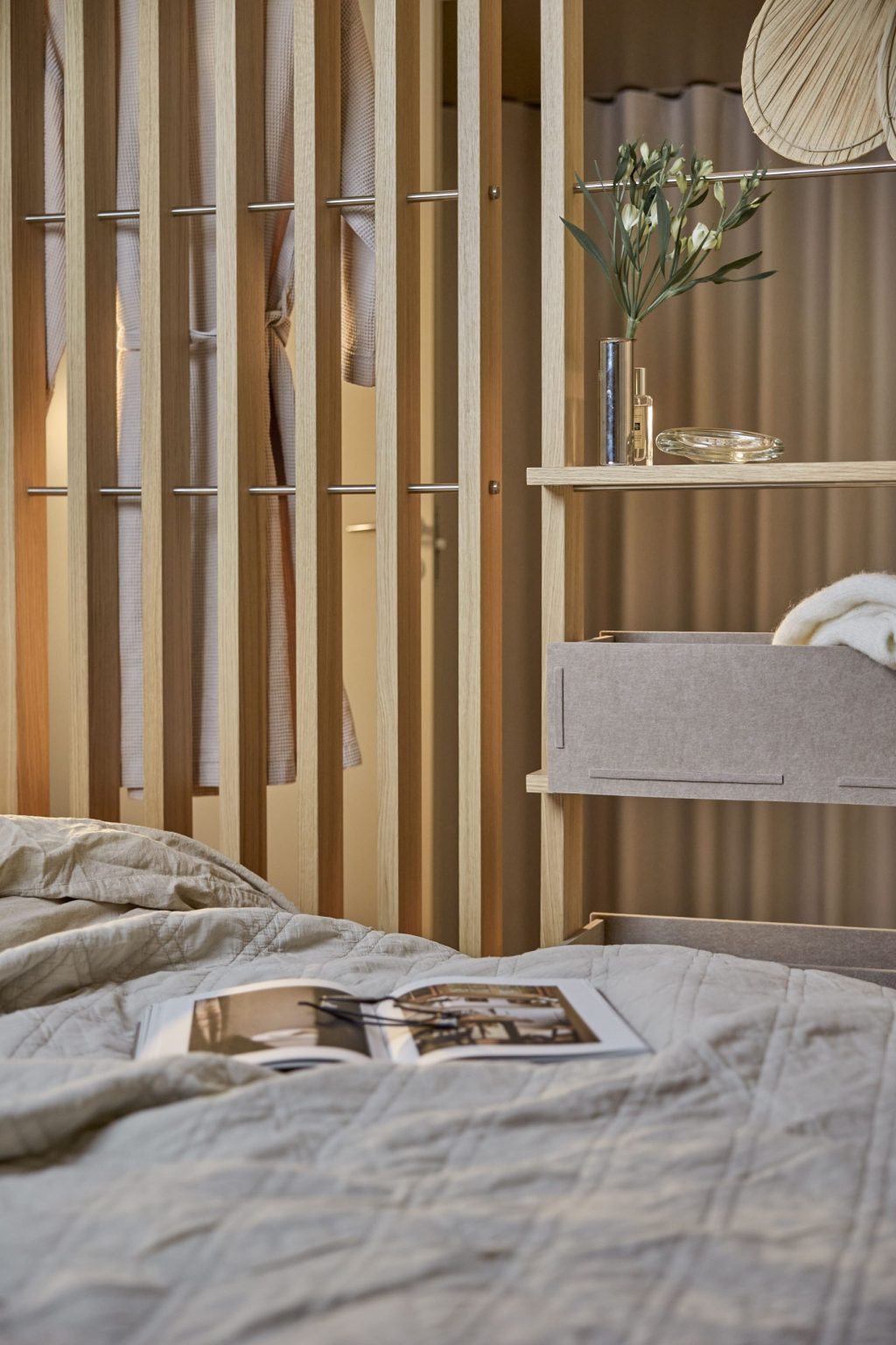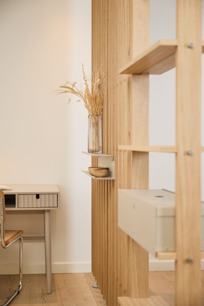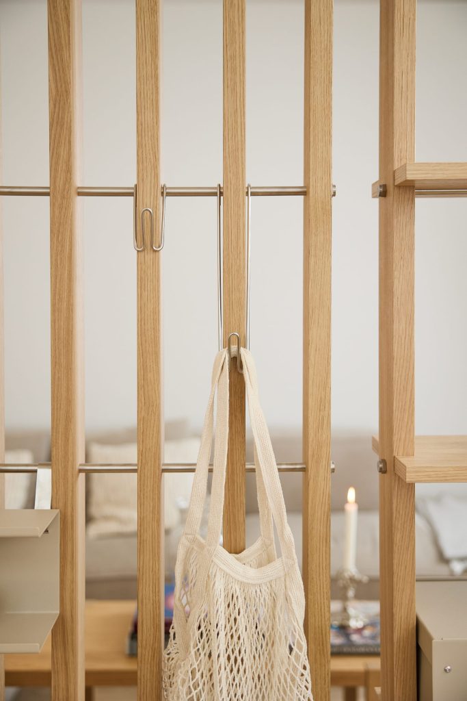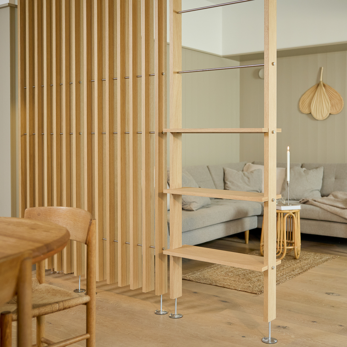 Embrace | BM1 est l’un des deux modules principaux du système Embrace. Fabriqué en placage de chêne et en acier inoxydable, BM1 se fixe entre le sol et le plafond et aide à créer des zones claires avec structure et but.