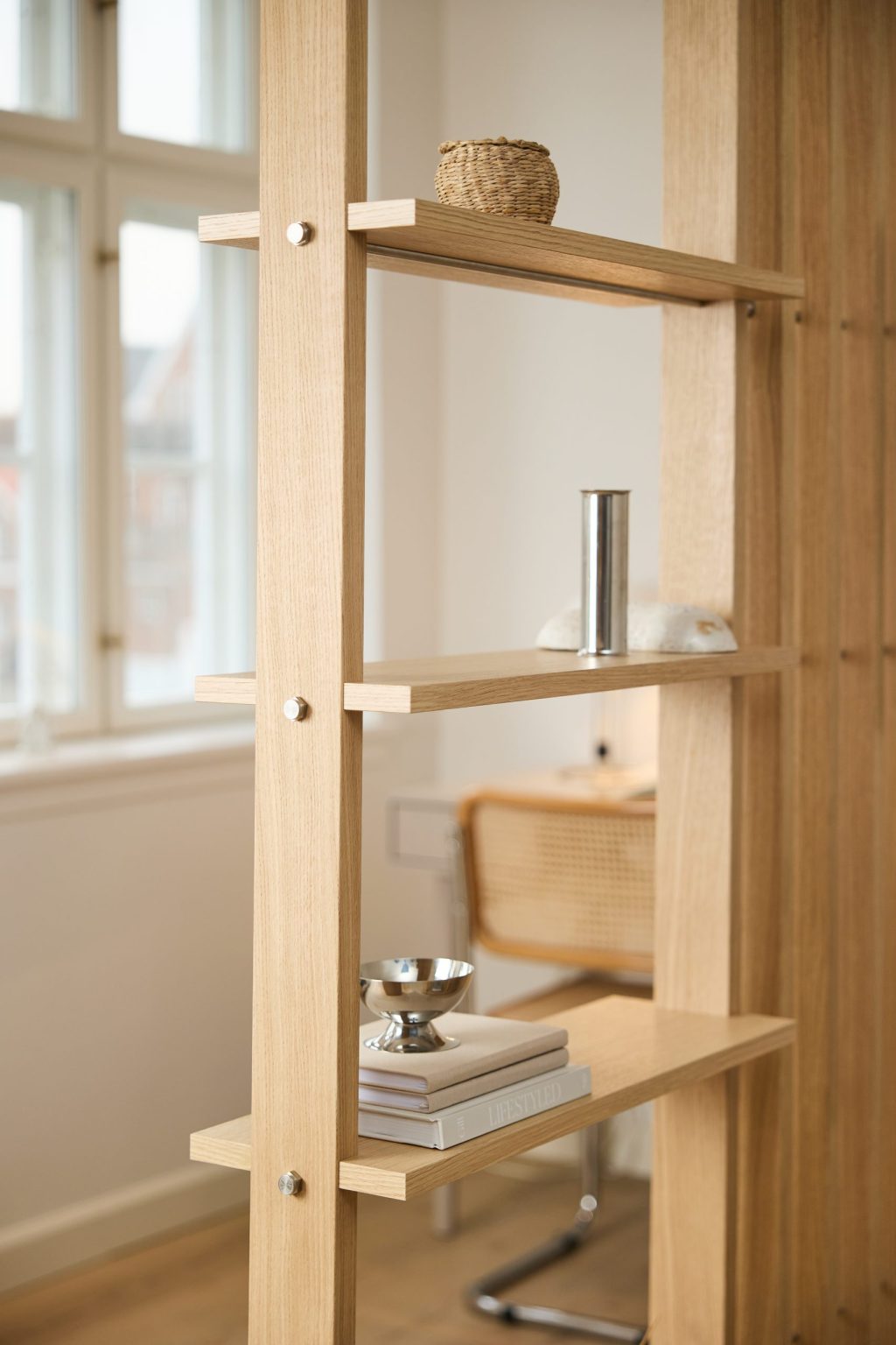 Embrace | BM2 ist eines der beiden Kernmodule im Embrace-System. Gefertigt aus natürlichem Eichenfurnier und Edelstahl wird BM2 zwischen Boden und Decke montiert und schafft ruhige Zonen, in denen Licht und Offenheit erhalten bleiben.