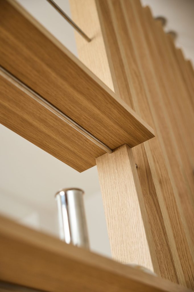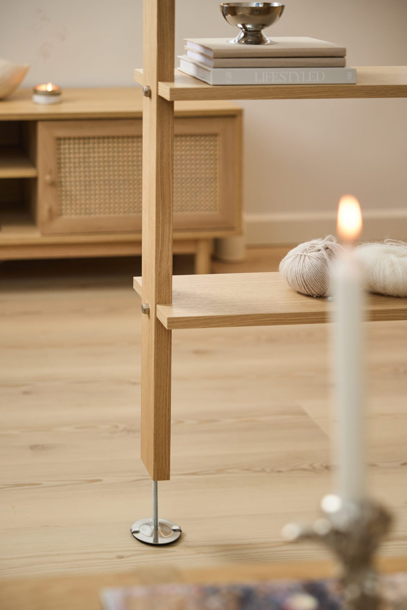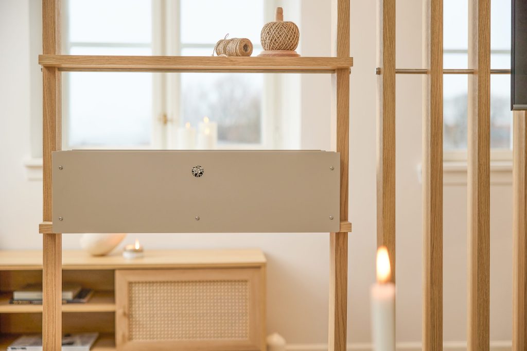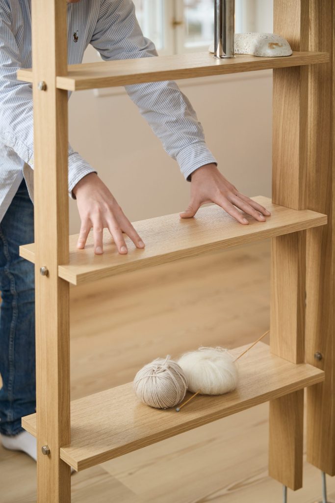 Das Eichenregal fügt Wärme hinzu und hilft, ein ruhigeres Gefühl im Raum zu schaffen. Natürliches Holz mildert das Aussehen des Raumteilers und verleiht ein ausgewogenes, skandinavisches Gefühl.