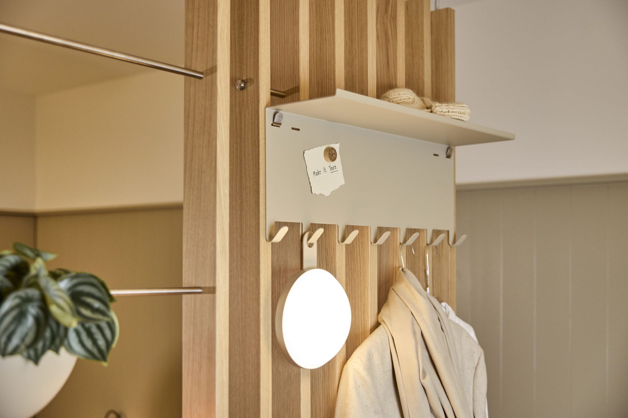 Das Nell | Coat Rack ist exklusiv für Embrace | BM1 konzipiert und passt zu beiden Modulhöhen.