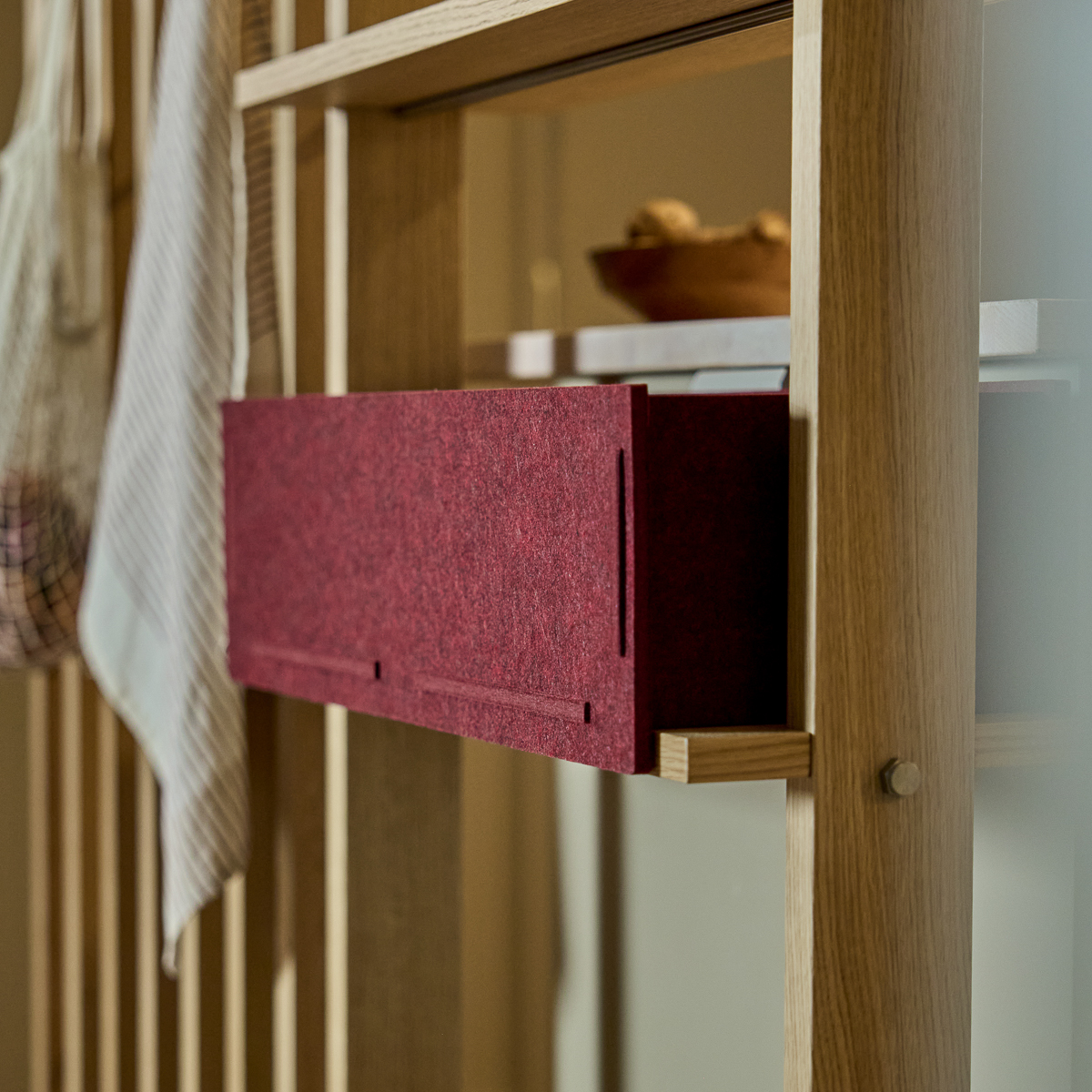 Die Vigg | Felt Box wurde speziell für das Lova | Wood Shelf entworfen und ist in ihren Abmessungen perfekt auf das Embrace | BM2 Modul abgestimmt.