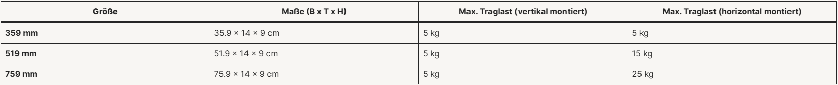 | Größe | Maße (B x T x H) | Max. Traglast (vertikal montiert) | Max. Traglast (horizontal montiert) |